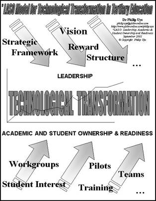 It is an art to effect change and sustainable technological transformation since people are central to this transformation process. The LASO Model can act as a guiding model or framework for the technological transformation of higher institutions in general, and in particular in developing environments.